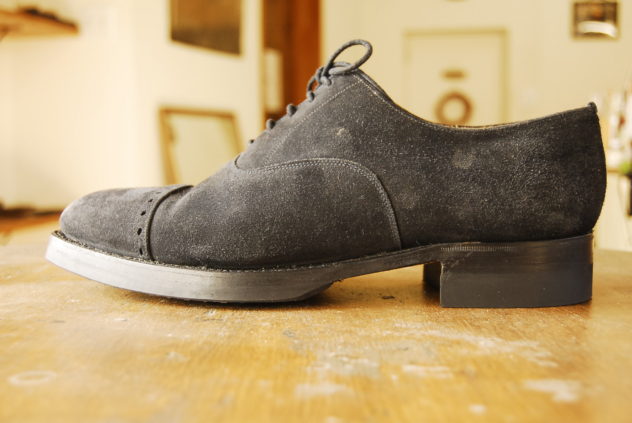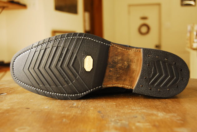 レザーソールの靴を雨使用にということから、ハーフラバーとラバーヒールを貼るというのはよくある選択肢だけれども、今回のは少々違う。